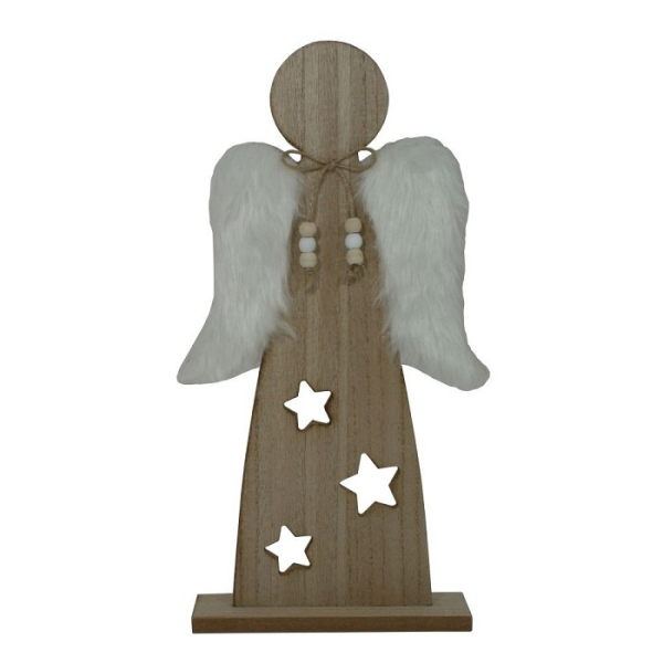 Dřevěný anděl s bílými křídly z kožíšku – hnědá a
