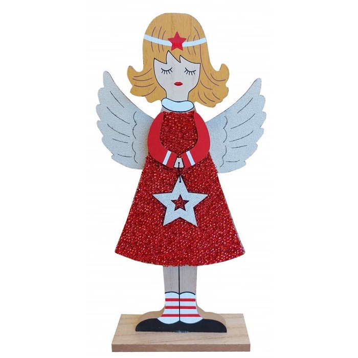 Dřevěná dekorace – anděl v červených šatech, 15 cm