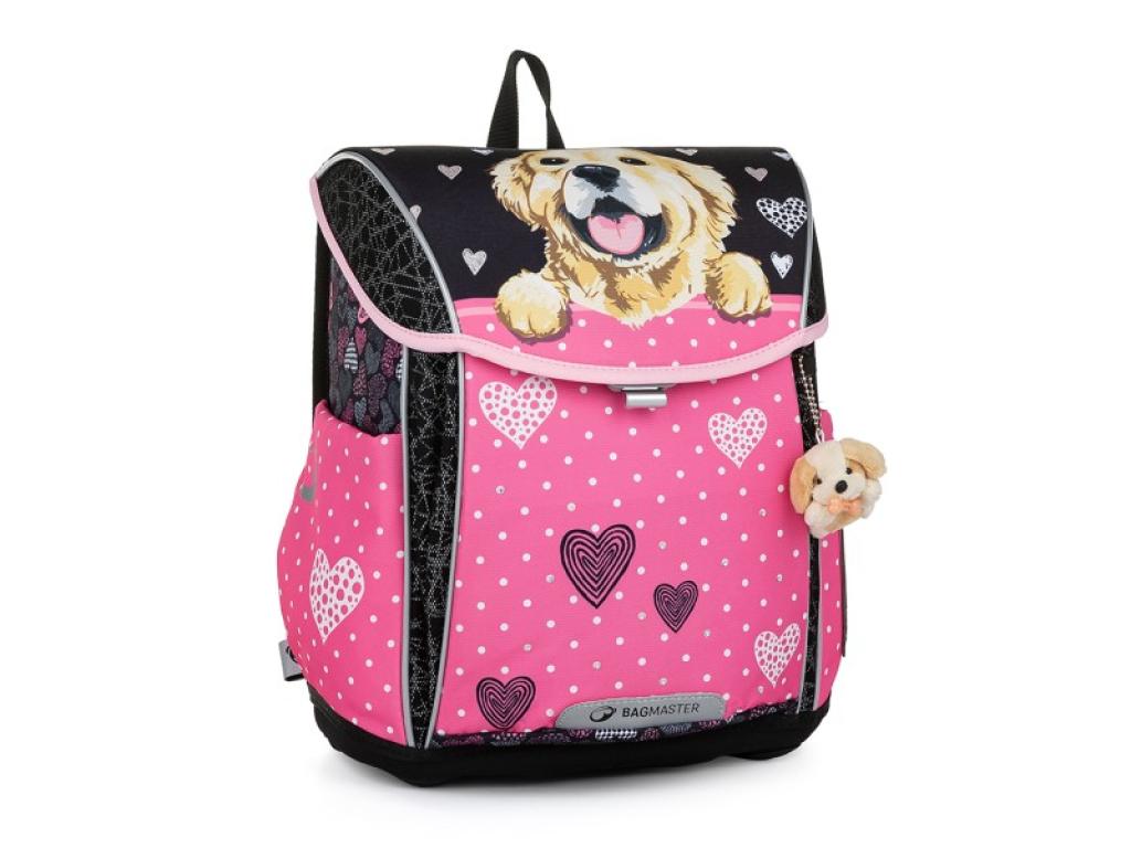 Na aktovce jsou třpytivá srdíčka a blištivé