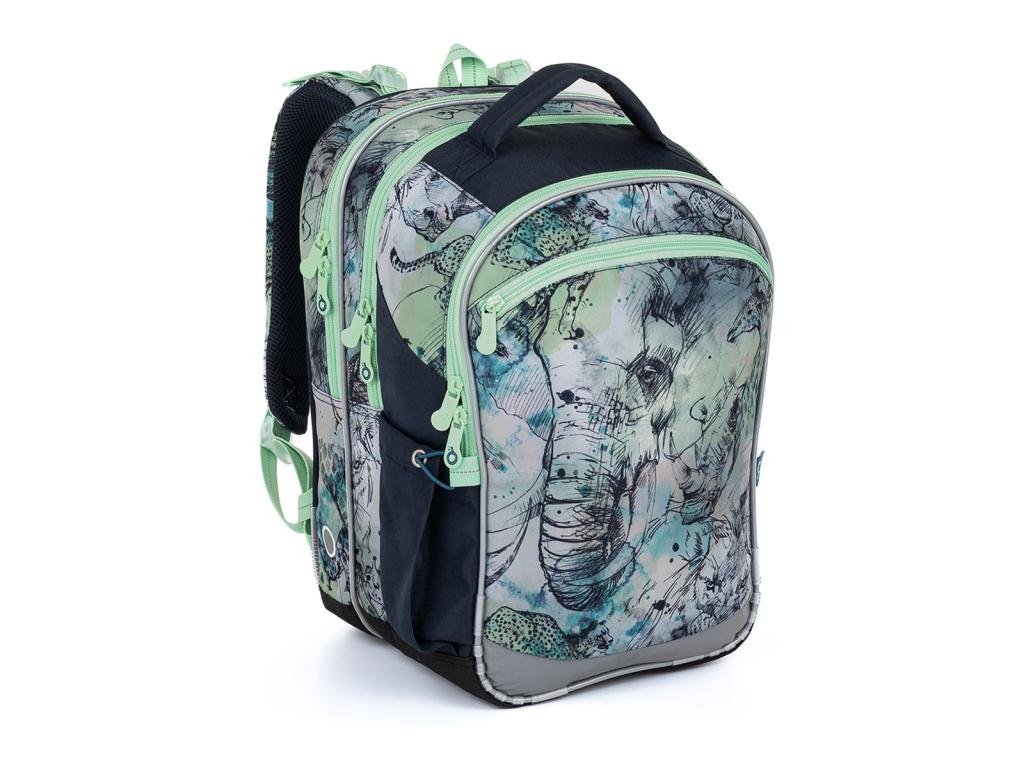 Khaki tříkomorový batoh se slonem a dalšími