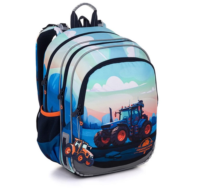 oranžovými detaily. Batoh má dvě objemné hlavní