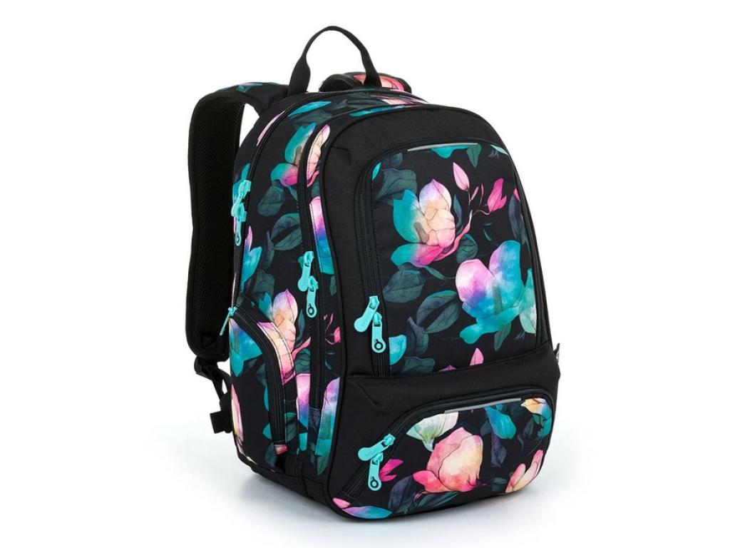 Černý dvoukomorový batoh s barevnými rododendrony
