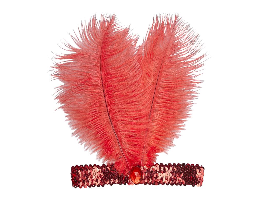 Červená flitová čelenka, 2 peříčky a kamínkem.
