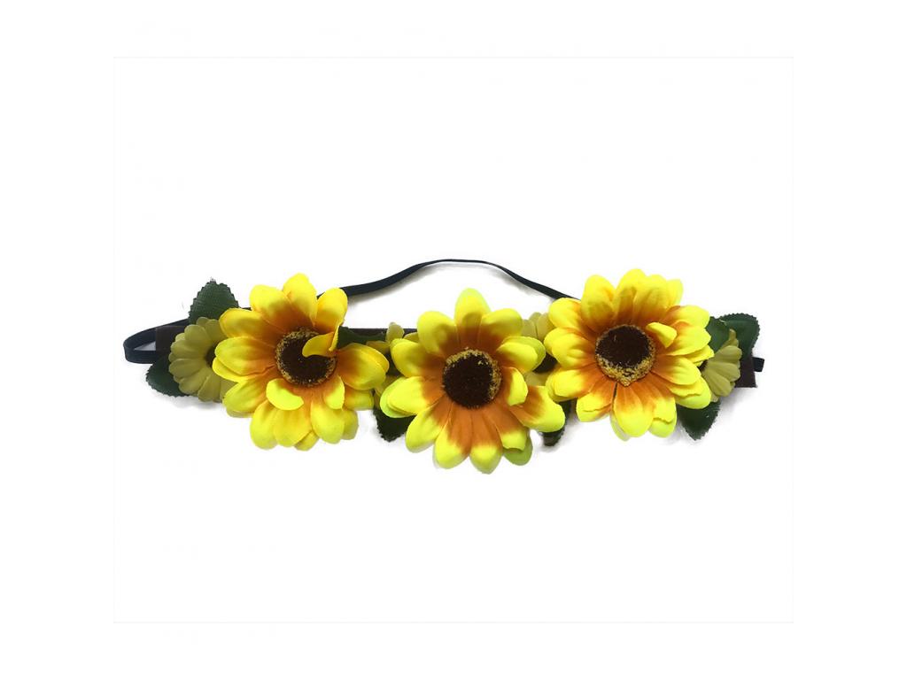 Půvabná čelenka zdobena žlutými květy a zelenými