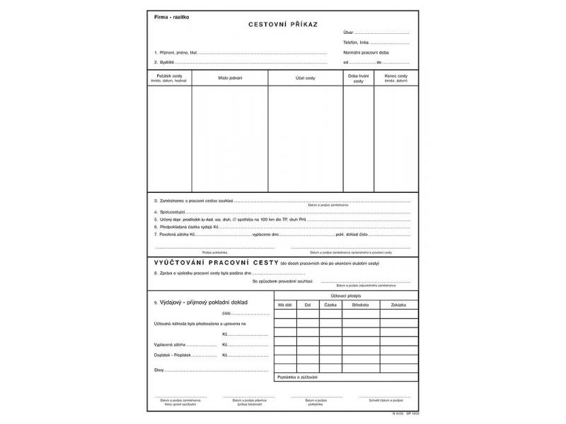 Cestovní příkaz formátu A4. Blok obsahuje 10