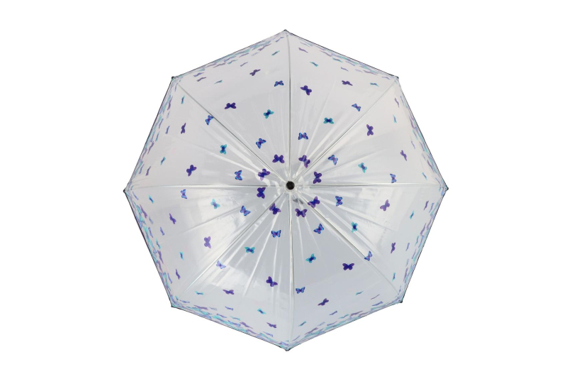 Průhledný deštník s motýlky, o průměru 80 cm.