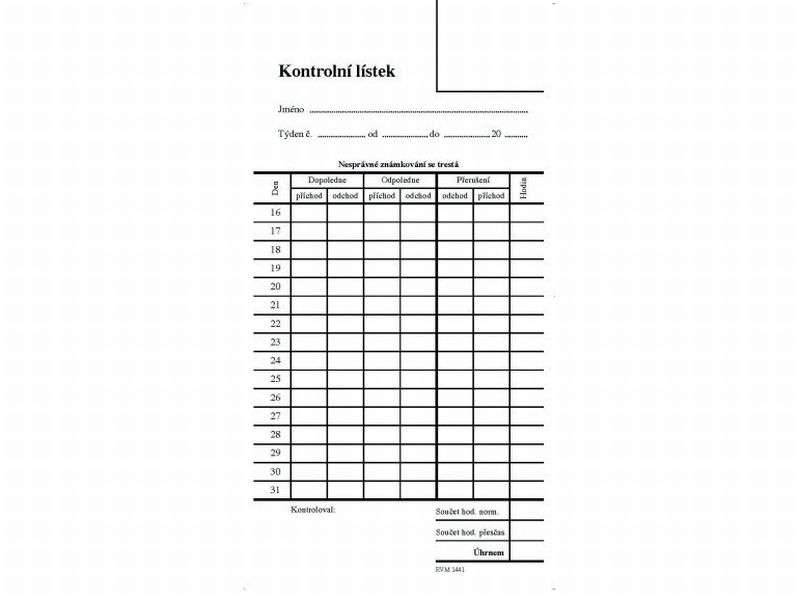 Docházkový lístek, píchačka. Obsahuje 10 listů v
