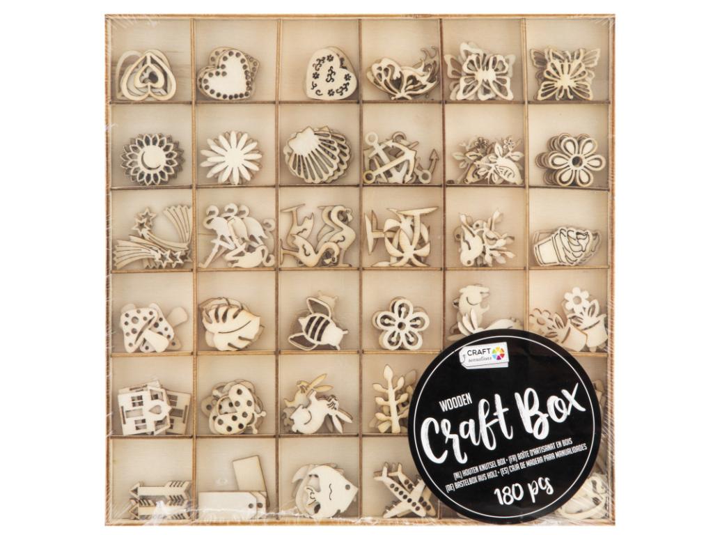 Dřevěná krabička se 180 ozdobami různých tvarů(36