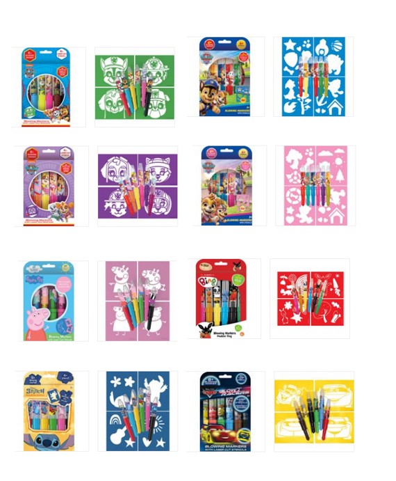 Balení obsahuje 6 barevných foukacích fixů a 4