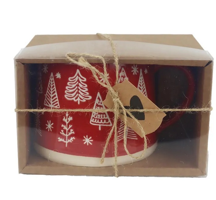 Keramický hrnek se stromečky v krabičce. Hrnek má