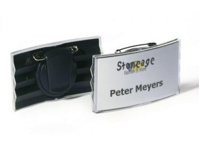 Moderně vypouklá jmenovka s vyměnitelným štítkem.