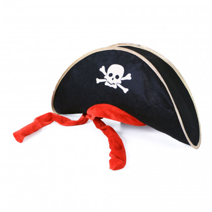 sametový klobouk je přizdoben potiskem pirátské