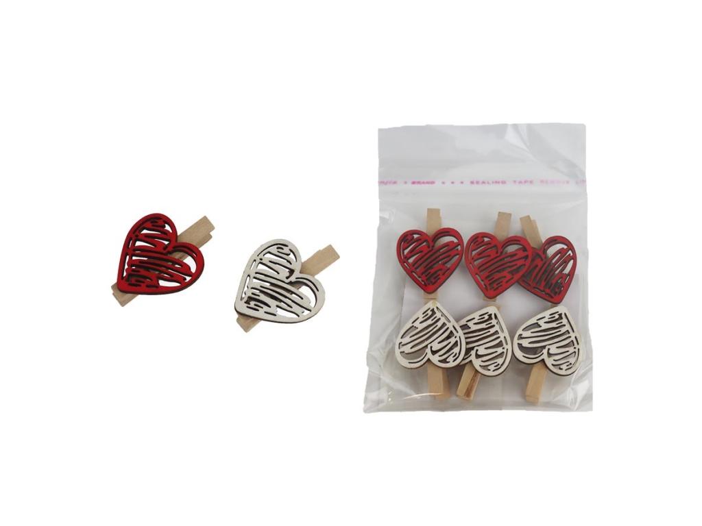 Kolíček srdce, bílé, červené, 6 kusů