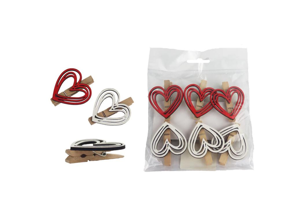 Kolíček srdce, bílé, červené, 6 kusů