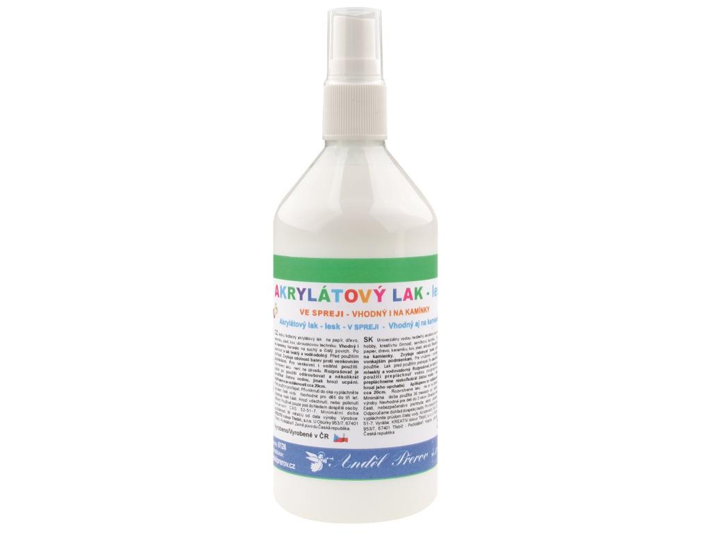 Akrylový lak, lesklý, v rozprašovači. Vodou