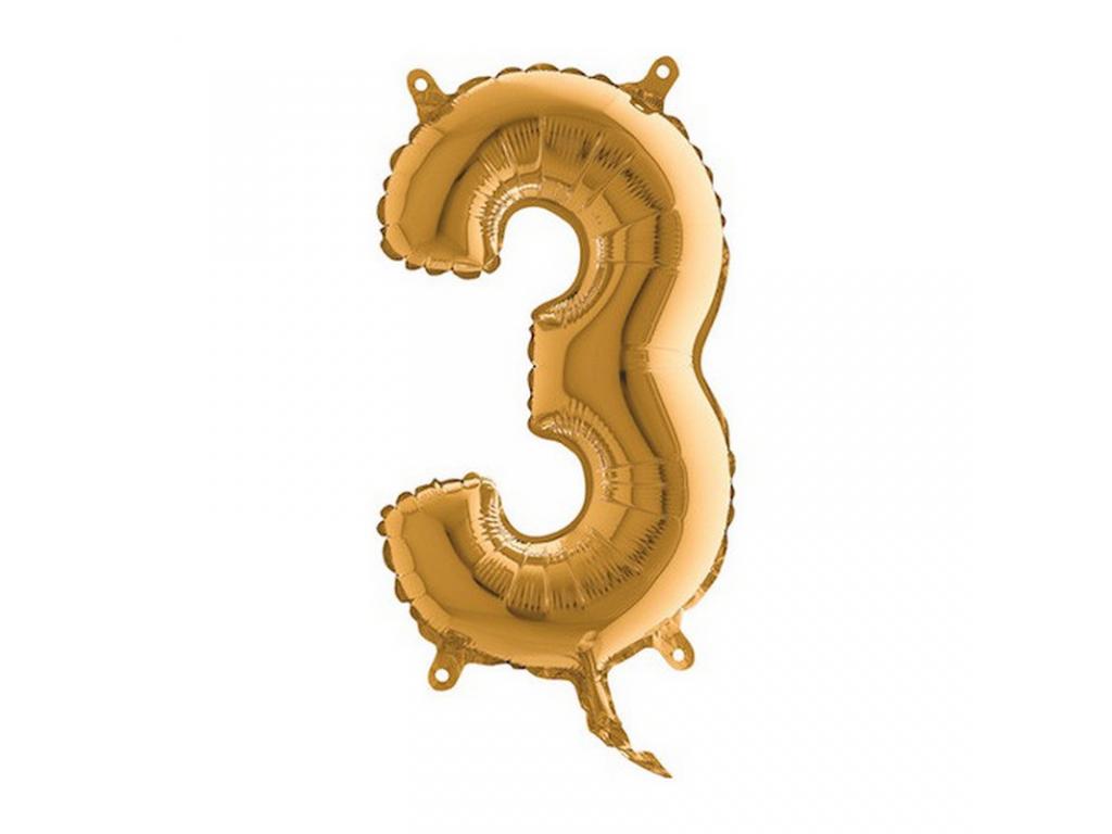 Foliový balónek ve tvaru číslice 3 ve zlaté barvě.