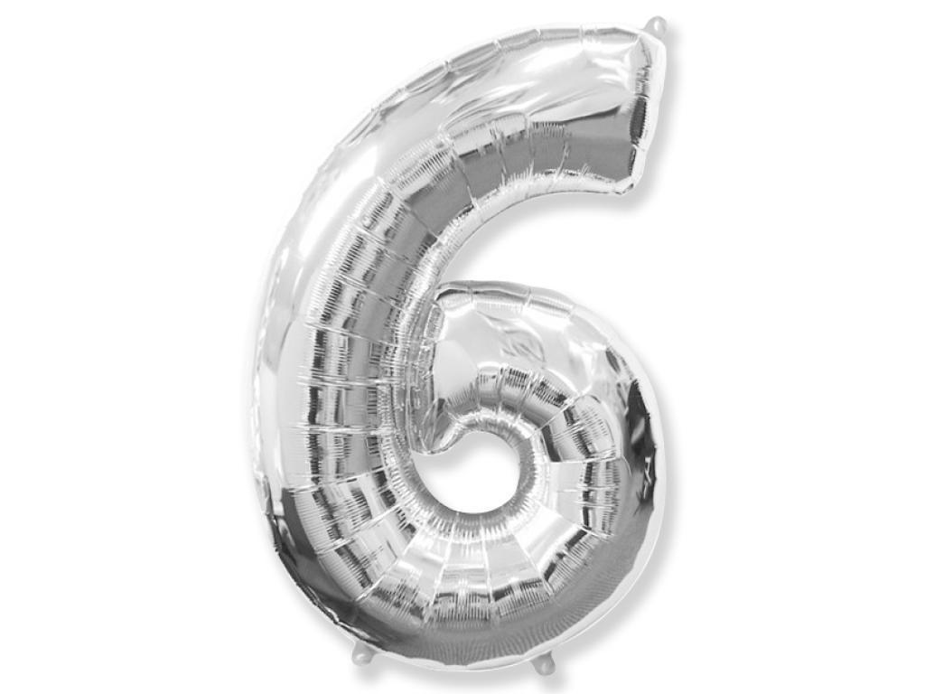 Fóliový balónek číslice 6. Stříbrná barva. Délka