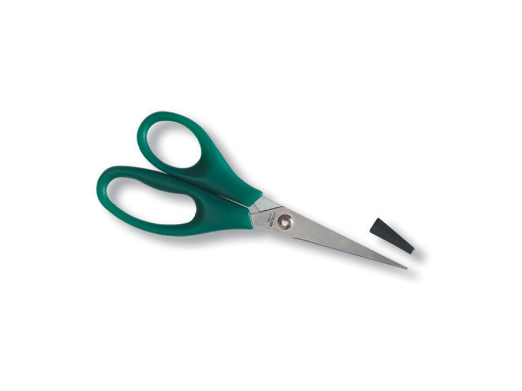 Špičaté školní nůžky s chránítkem. Dlouhé 13cm,