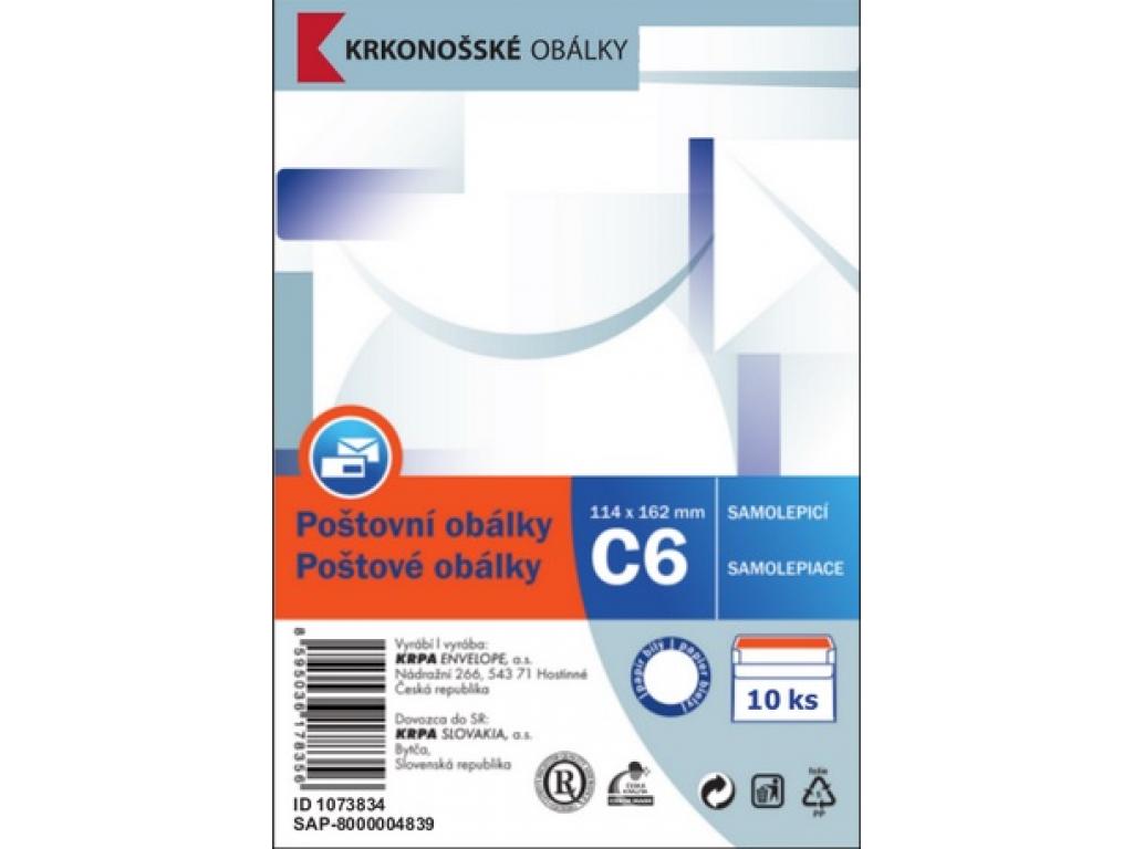 Obálky samolepicí C6. Rozměr 114 x 162 mm, gramáž
