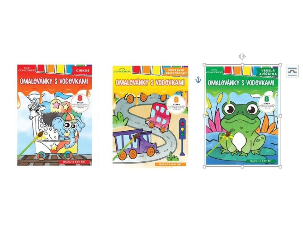 Omalovánky s vodovkami obsahují 8 veselých obrázků