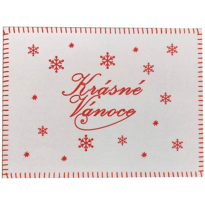 Jemný podklad zdobí červené sněhové vločky a nápis