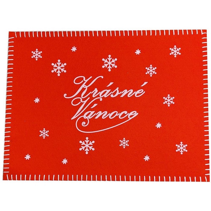 filcu. Jemný podklad zdobí červené sněhové vločky