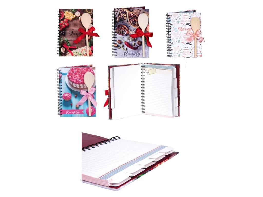 Kniha na recepty s vařečkou v různých motivech.