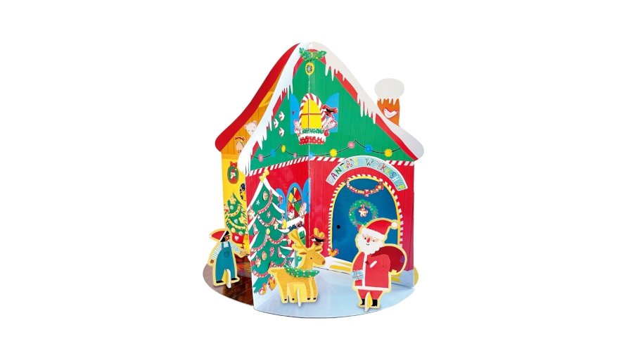 kartonový domeček s motivem vánoční dílny.