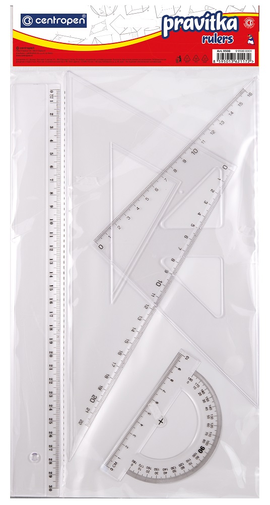 trojúhelník 60°-250, úhloměr 180°-100 s ryskou a