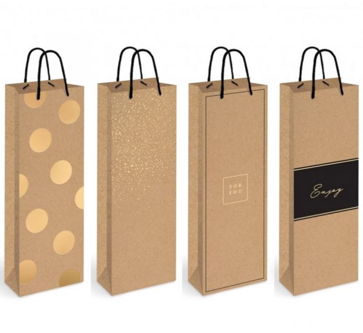 Dárková taška na láhev Kraft se zlatými prvky.