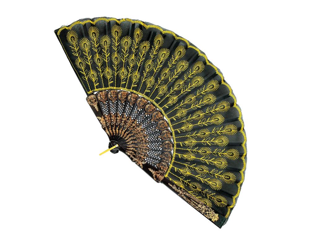 Ozdobný španělský vějíř, žlutý vzor, látkový.