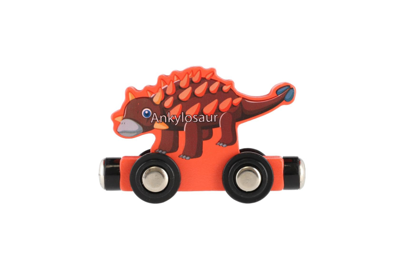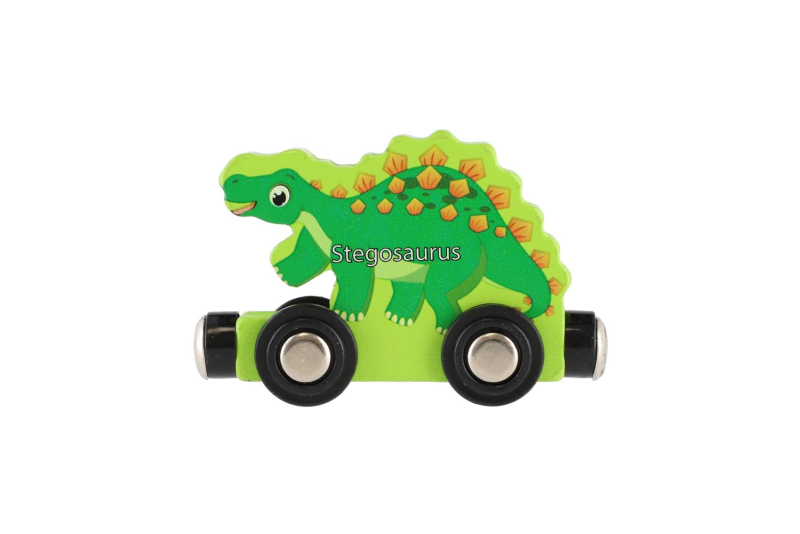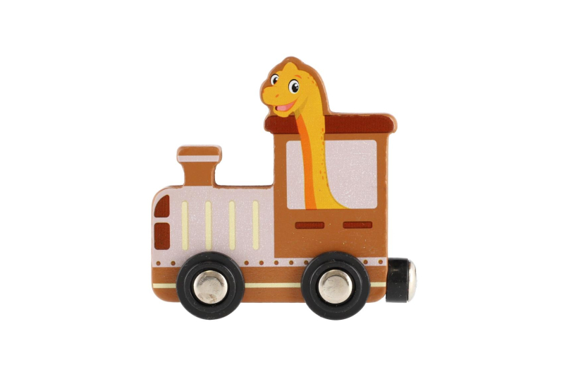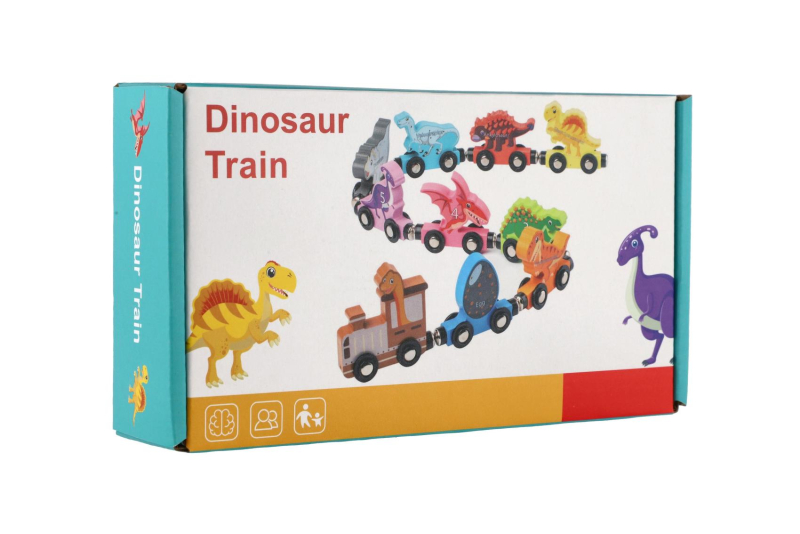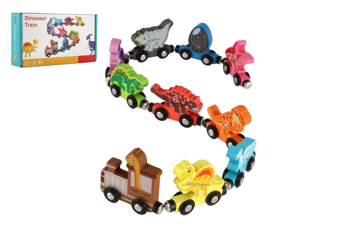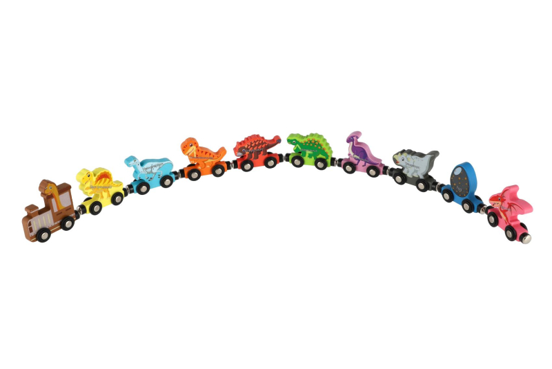 Barevný dřevěný vláček s motivy dinosaurů potěší