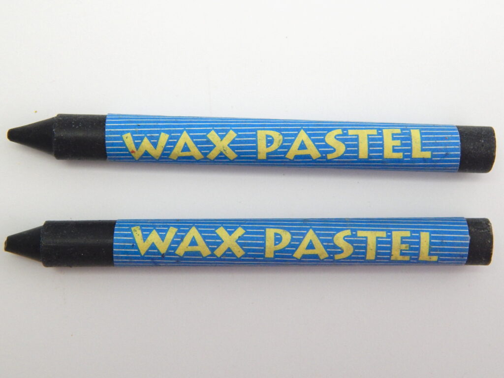 pruhovaným se žlutým textem WAX CRAYON.