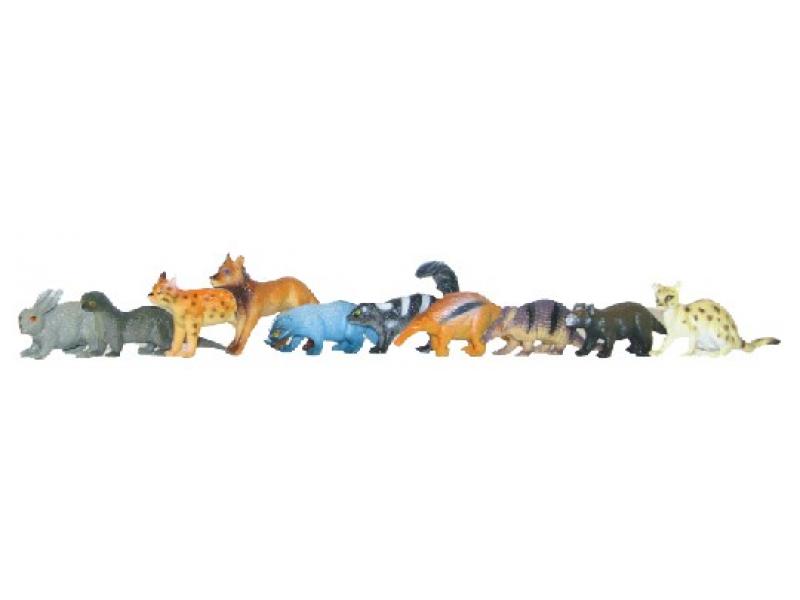 Figurky lesních zvířat jako jsou veverka, vlk,